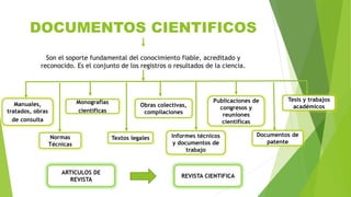 Este documento describe diferentes tipos de documentación científica, incluyendo manuales, monografías, obras colectivas, publicaciones de congresos, tesis, normas técnicas, informes técnicos, documentos de patentes, textos legales, artículos de revista y revistas científicas. Explica las características y funciones de cada tipo de documento para comunicar y sistematizar el conocimiento científico.