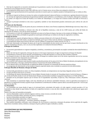 Este documento describe los principales ecosistemas de México, incluyendo selvas, bosques, matorrales, pastizales y humedales. Se detalla la vegetación, clima y distribución geográfica de cada ecosistema, como las selvas perennifolias del sureste con árboles de más de 25 metros, los bosques de coníferas en zonas montañosas con pinos y abetos, y los humedales a lo largo de la costa y ríos. Muchos de estos ecosistemas se han visto amenazados por