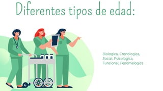 Este documento describe diferentes tipos de edad como biológica, cronológica, psicológica, social y funcional. La edad biológica se refiere a los procesos fisiológicos del cuerpo, la cronológica al tiempo desde el nacimiento, la psicológica a capacidades mentales, la social a roles en la sociedad y la funcional a la capacidad para realizar actividades diarias. Todas estas dimensiones del envejecimiento están relacionadas aunque cada persona las experimenta de manera única.