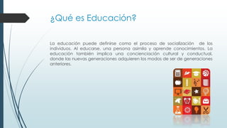 La educación puede definirse como el proceso de socialización y aprendizaje de conocimientos en individuos. Existen varias modalidades educativas como la presencial, presencial apoyada con TIC, escolarizada, a distancia, en línea, virtual y síncrona y asincrónica. Cada modalidad se caracteriza por el uso y nivel de integración de las tecnologías de la información y comunicación.