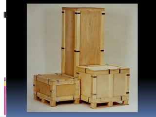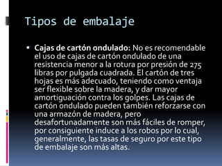 El documento describe diferentes tipos de embalaje para exportar productos, incluyendo cajas de cartón, cajones de madera contrachapada, jaulas de madera, cajones y jaulas con ligaduras de alambre, sacos de papel, fardos y contenedores. Cada tipo tiene ventajas y desventajas respecto a la resistencia, peso, protección contra robos y daños. El uso de contenedores se recomienda para el transporte internacional por su facilidad de carga en diferentes medios de transporte sin necesidad de desempacar.