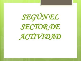 Este documento describe los diferentes tipos de empresas según su sector de actividad, tamaño, propiedad del capital, ámbito de actividad, destino de los beneficios y forma jurídica. Explica que las empresas se pueden clasificar como primarias, secundarias o terciarias dependiendo del sector; y como grandes, medianas, pequeñas o microdependiendo del tamaño. Además, diferencia empresas privadas, públicas y mixtas según la propiedad del capital y locales, provinciales, regionales, nacionales o multinacionales según el ámb