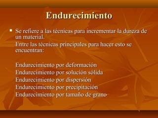 Este documento describe los principales tipos de endurecimiento de materiales, incluyendo endurecimiento por deformación, endurecimiento por solución sólida, endurecimiento por dispersión, endurecimiento por precipitación y endurecimiento por tamaño de grano. Explica cómo cada uno de estos métodos incrementa la dureza de un material al obstaculizar el movimiento de dislocaciones dentro de la estructura cristalina.