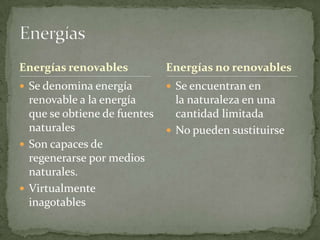 El documento describe diferentes tipos de energías renovables como la energía mareomotriz, solar, geotérmica y eólica, explicando sus fuentes y cómo se generan electricidad a partir de ellas. También menciona ejemplos de instalaciones de energías renovables en México.