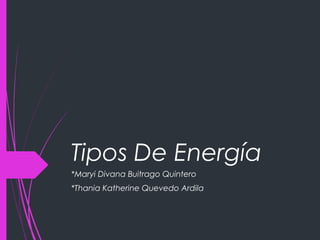 Este documento resume diversos tipos de energía, incluyendo la energía eléctrica, mecánica, térmica, eólica, lumínica, solar, nuclear, cinética, potencial, química, hidráulica, sonora, radiante, fotovoltaica, de reacción, iónica, geotérmica, mareomotriz, electromagnética, metabólica, hidroeléctrica y calorífica. Define cada tipo de energía y explica brevemente su origen y características.