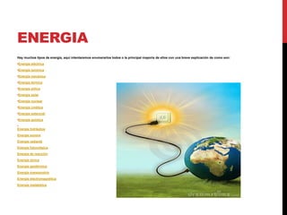 Este documento resume los diferentes tipos de energía, incluyendo la energía eléctrica, lumínica, mecánica, térmica, eólica, solar, nuclear, cinética, potencial, química, hidráulica, sonora, radiante, fotovoltaica, de reacción, iónica, geotérmica, mareomotriz, electromagnética y metabólica. Proporciona una breve descripción de cada tipo de energía.