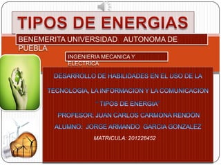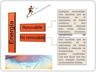 El documento describe el concepto de energía como la capacidad de realizar trabajo y su relación con el movimiento y la transformación. Se detallan diversas fuentes de energía, sus ventajas y desventajas, así como su impacto en la economía y el medio ambiente. También se menciona la creciente popularidad de energías renovables como la solar y eólica, y su importancia para el desarrollo sustentable.
