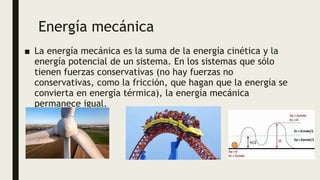 El documento describe los diferentes tipos de energías, incluyendo la energía mecánica, cinética, sonora, potencial, gravitatoria, eléctrica, química, térmica, nuclear, radiante, magnética, solar, lumínica, hidráulica, eólica. Concluye que existen muchos tipos de energías que son prácticas para la vida diaria como la energía luminosa y eléctrica.