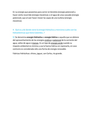 El documento trata sobre la energía eólica en Colombia. Propone usar el método de opciones reales para valorar una inversión en un proyecto de generación de energía eólica en Colombia, apoyado por un modelo de dinámica de sistemas que reproduce la interacción entre las variables del mercado que determinan las condiciones de operación de los proyectos y que influyen en la decisión de inversión. Presenta los resultados encontrados y concluye sobre la utilidad de las opciones reales para valorar inversiones en proyectos de generación de energía e