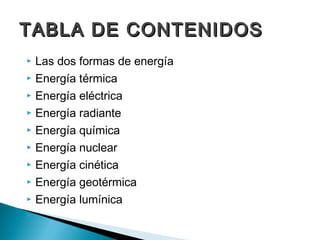 El documento describe los diferentes tipos de energía, incluyendo la energía térmica, eléctrica, radiante, química, nuclear, cinética, geotérmica, lumínica, mecánica, solar, potencial, hidráulica, sonora, fotovoltaica, de reacción, mareomotriz, iónica, electromagnética, metabólica e hidroeléctrica.