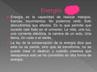 Este documento describe diferentes tipos de energía, incluyendo la energía hidroeléctrica, eólica, eléctrica, química, nuclear y térmica. Explica que la energía hidroeléctrica aprovecha la energía potencial del agua en movimiento para generar electricidad, mientras que la energía eólica usa la energía cinética del viento. También describe la energía química producida en reacciones, la nuclear liberada en procesos atómicos y la térmica manifestada como calor.