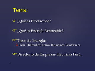 El documento describe los diferentes tipos de energía renovable, incluyendo energía solar, hidráulica, eólica, biomasa y geotérmica. Explica brevemente cada tipo de energía renovable, sus ventajas y desventajas. También menciona algunas empresas eléctricas en Costa Rica y el dilema del desarrollo eléctrico sustentable para satisfacer la demanda de energía en el país.
