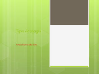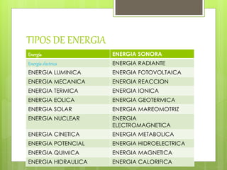 El documento resume los diferentes tipos de energía, incluyendo la energía eléctrica, luminica, mecánica, térmica, eólica, solar, nuclear, cinética, potencial, química, hidráulica, sonora, radiante, fotovoltaica, de reacción, iónica, geotérmica, mareomotriz, electromagnética, metabólica, hidroeléctrica, magnética y calorífica. Define brevemente cada tipo de energía y su origen o características principales.