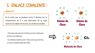 Este documento describe diferentes tipos de enlaces químicos, incluyendo enlaces covalentes, iónicos y de hidrógeno. Los enlaces covalentes se forman cuando los átomos comparten electrones y pueden ser polares u apolares. Los enlaces iónicos se producen por la transferencia de electrones entre un metal y un no metal. Los puentes de hidrógeno son interacciones dipolo-dipolo entre un átomo de hidrógeno y un átomo electronegativo como oxígeno, nitrógeno o flúor.
