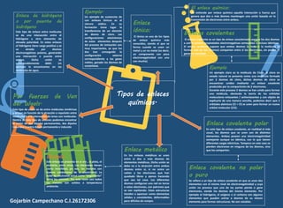 El documento describe los diferentes tipos de enlaces químicos, incluyendo enlaces iónicos entre metales y no metales, enlaces covalentes entre átomos que comparten electrones, enlaces metálicos entre cationes y electrones libres, y enlaces débiles como los de hidrógeno y van der Waals. Se proveen ejemplos claros de cada tipo de enlace químico.