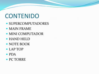 Este documento resume las características de diferentes tipos de computadoras como supercomputadoras, mainframes, mini computadoras, computadoras de mano, portátiles, laptops, asistentes digitales personales y computadoras de torre, describiendo sus velocidades de procesamiento, capacidades de usuario, tamaños, facilidad de uso, clientes típicos e impacto social.