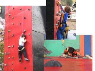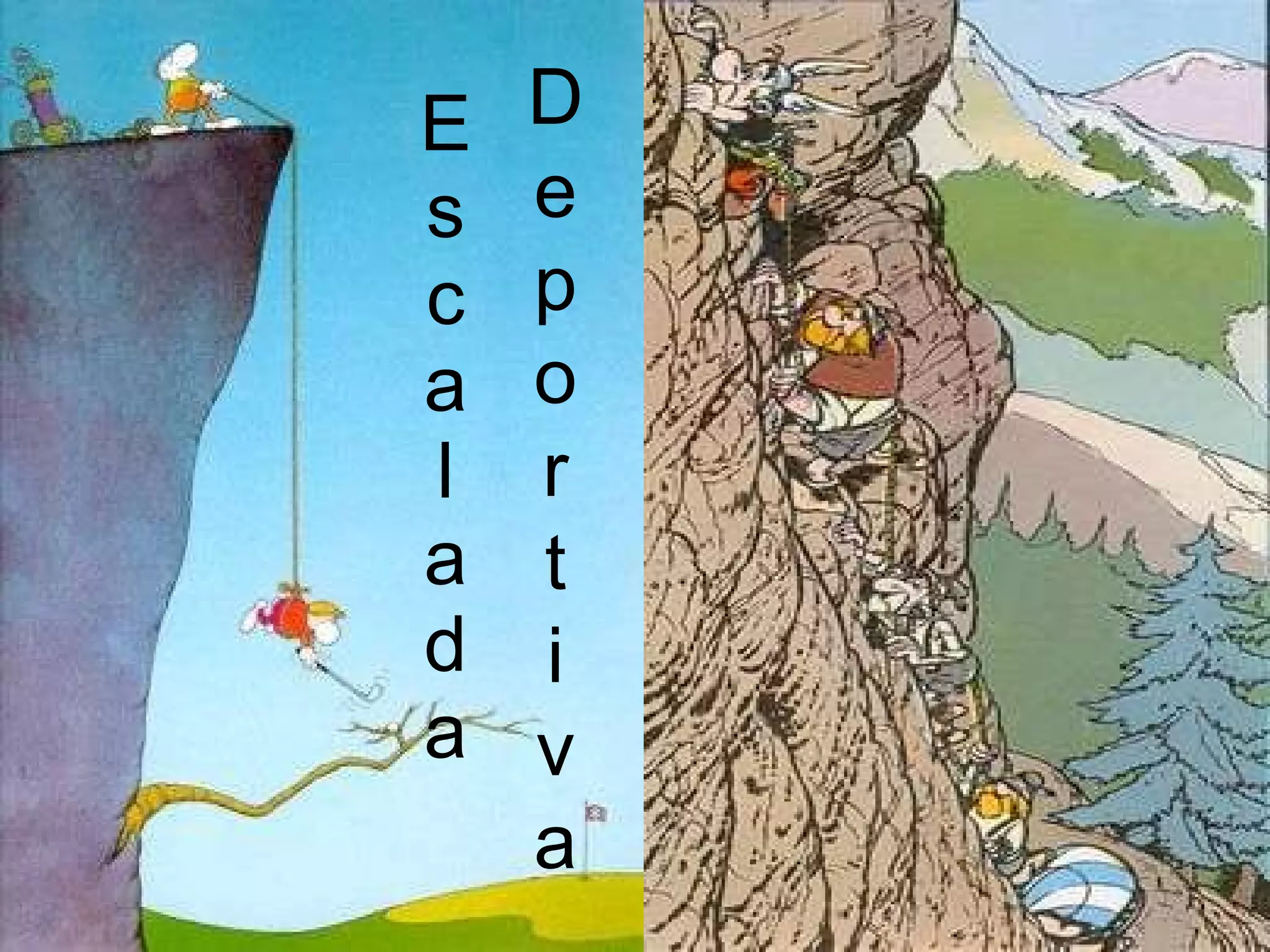 El documento describe los diferentes tipos de escalada deportiva, incluyendo el montañismo, la escalada en roca y en hielo. Detalla los distintos estilos de escalada en roca como la libre, con aseguramiento, sólo integral, punteando y clean climbing. También explica los diferentes ángulos y formas de la roca como vertical, extraplomo, techo, diedro, grieta y chimenea.