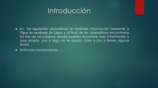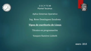 Este documento describe los principales tipos de escritorios de Linux, incluyendo GNOME, KDE, Unity, XFCE y LXDE. Explica que Linux ofrece la posibilidad de personalizar el escritorio, y que estos entornos varían en su grado de personalización, recursos requeridos y objetivos. El documento también menciona otros entornos más ligeros como XFast, Enlightenment, ROX Desktop y Equinox. Concluye que Linux permite cambiar fácilmente el tipo de escritorio sin riesgos.