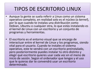 Este documento describe varios escritorios populares de Linux como Gnome, KDE, XFCE y otros. Gnome clásico y Gnome 3 Shell se enfocan en crear un escritorio simple e intuitivo, mientras que KDE ofrece muchas más opciones de personalización. Otros escritorios alternativos incluyen XFCE, LXDE y Awesome, cada uno con sus propias ventajas en cuanto a rendimiento y funcionalidad.