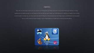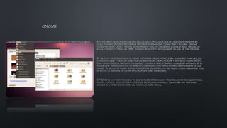 Este documento discute las ventajas de personalizar el entorno de escritorio en Linux y algunas de las opciones populares como GNOME, KDE, Xfce y LXDE. Recomienda elegir entornos ligeros como Xfce o LXDE para equipos antiguos o máquinas virtuales con pocos recursos, mientras que GNOME o KDE son mejores opciones para equipos más nuevos que puedan aprovechar sus funcionalidades avanzadas.