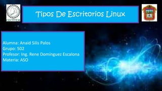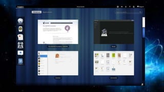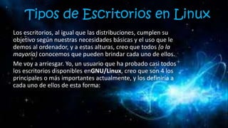 Este documento describe y compara cuatro de los principales escritorios de Linux: KDE, Gnome, Xfce y LXDE. KDE se describe como el escritorio más completo y productivo, mientras que Gnome se considera el rey sin trono. Xfce se presenta como una alternativa más ligera a Gnome 2 y LXDE es el más pequeño y rápido pero menos potente de los cuatro.