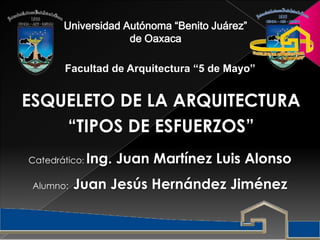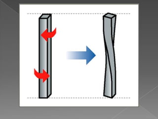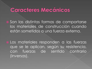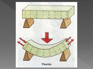 Este documento describe los diferentes tipos de esfuerzos a los que pueden someterse los materiales de construcción. Identifica la elasticidad, plasticidad, rigidez, dureza, tensión, compresión, tracción, flexión y cizalladura como formas en que los materiales pueden responder a fuerzas externas aplicadas. Explica brevemente cada uno de estos tipos de esfuerzos.