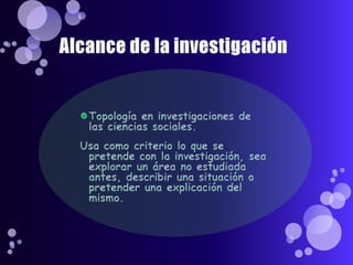 Este documento resume los diferentes tipos de diseños de investigación, incluyendo exploratorios, descriptivos, correlacionales, explicativos, experimentales, cuasiexperimentales, longitudinales y transversales. Explica brevemente el propósito de cada diseño y algunas de sus características clave.