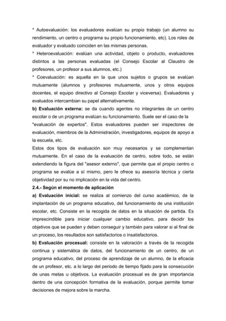 Este documento describe diferentes tipos de evaluación educativa según varios criterios como su finalidad, extensión, agentes evaluadores, momento de aplicación y criterio de comparación. Algunos tipos de evaluación mencionados son la formativa, sumativa, global, parcial, interna, externa, inicial, procesual, final, autoevaluación, heteroevaluación, coevaluación y evaluaciones basadas en la autorreferencia o heterorreferencia normativa o criterio.