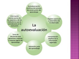 Este documento describe tres tipos de evaluación: autoevaluación realizada por los estudiantes sobre su propio aprendizaje, coevaluación entre compañeros de clase, y heteroevaluación realizada por docentes. Explica que la autoevaluación y coevaluación tienen la ventaja de ser sencillas y económicas, y que ayudan a los estudiantes a reflexionar sobre su progreso. También menciona algunas técnicas para la autoevaluación como contratos didácticos y portafolios.