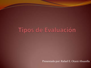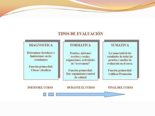 El documento describe tres tipos de evaluación: la evaluación diagnóstica, que determina la preparación de los estudiantes para un curso; la evaluación formativa, que informa sobre el progreso de los estudiantes y localiza deficiencias; y la evaluación sumaria, que valora los logros de los estudiantes al final de un curso y certifica el cumplimiento de los objetivos.