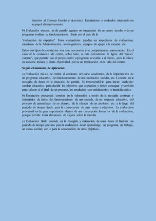 Este documento describe diferentes tipos de clasificaciones para la evaluación educativa. Se puede clasificar la evaluación según su finalidad (formativa o sumativa), su extensión (global o parcial), los agentes evaluadores (interna o externa), o el momento de aplicación (inicial, procesual o final). La evaluación formativa se utiliza para mejorar los procesos educativos, mientras que la sumativa determina el valor de productos terminados.