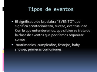 El documento describe diferentes tipos de eventos. Se dividen los eventos en sociales, corporativos y por su tamaño, lugar y tipo. Los eventos sociales se enfocan en el entretenimiento de los invitados y pueden realizarse en salones, exteriores o casas. Los corporativos buscan vincular empresas con socios, empleados y clientes. Los eventos también se clasifican por su tamaño (pequeño, mediano, grande o mega), lugar (al aire libre o cerrado) y tipo (sociales, masivos, religiosos, culturales