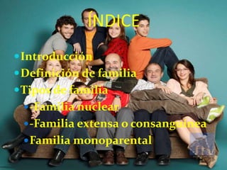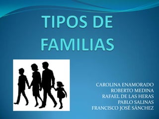Este documento describe tres tipos principales de familias: la familia nuclear, la familia extensa y la familia monoparental. La familia nuclear consiste en padres e hijos, mientras que la familia extensa incluye varias unidades nucleares como abuelos, tíos y primos. La familia monoparental está formada por uno de los padres y sus hijos. El documento también discute brevemente algunos posibles problemas asociados con cada tipo de familia, como aislamiento, pérdida de atención a los hijos y baja autoestima.