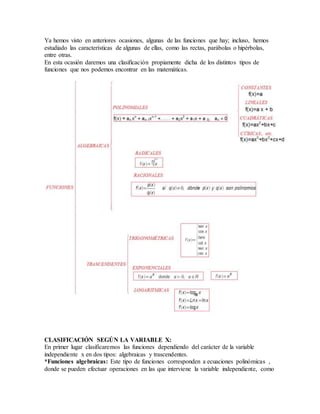 El documento clasifica las funciones en dos categorías: funciones algebraicas y funciones trascendentes. Las funciones algebraicas incluyen funciones constantes, lineales, afines, cuadráticas, racionales y radicales. Las funciones trascendentes incluyen funciones exponenciales, logarítmicas y trigonométricas. También clasifica las funciones como explícitas o implícitas dependiendo de si la variable y está despejada o no.