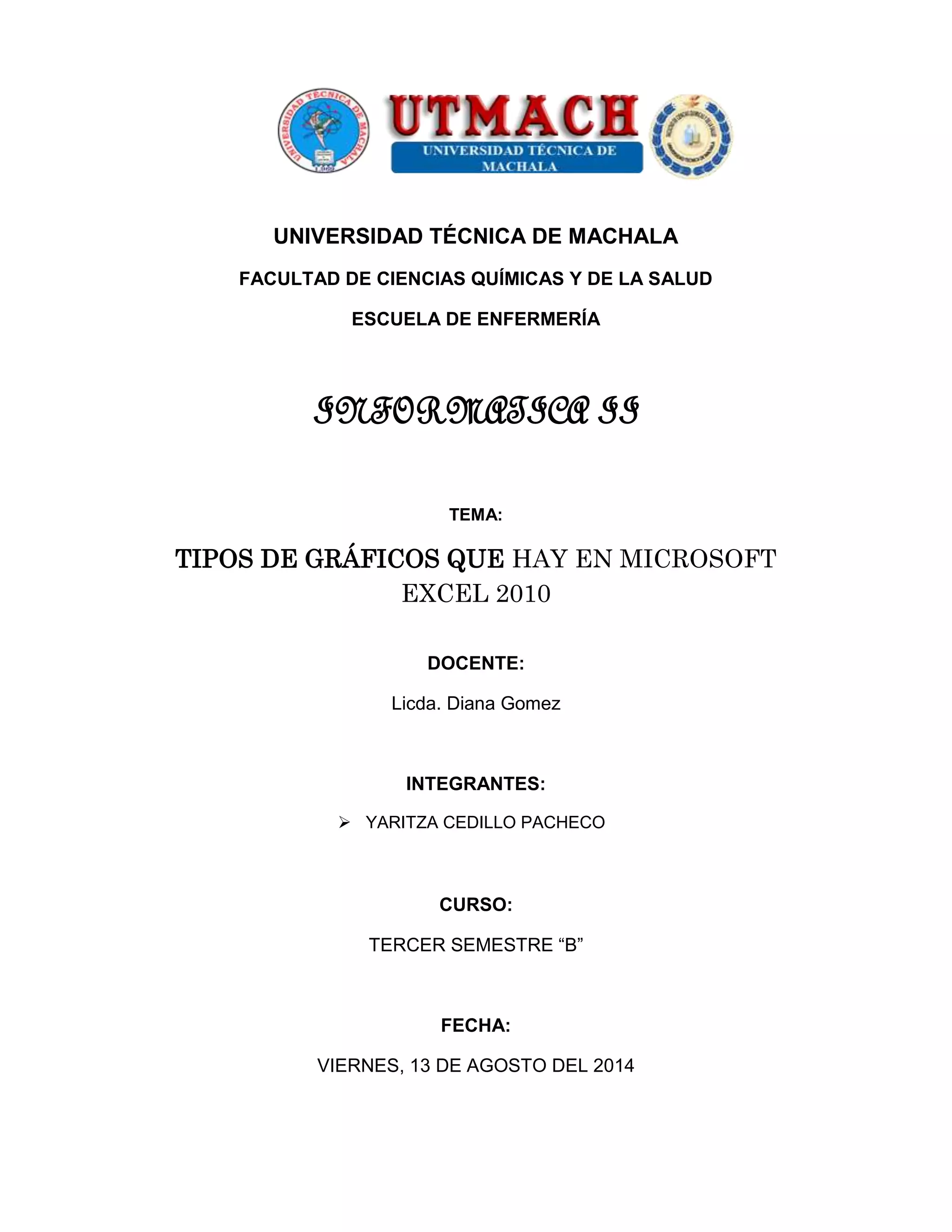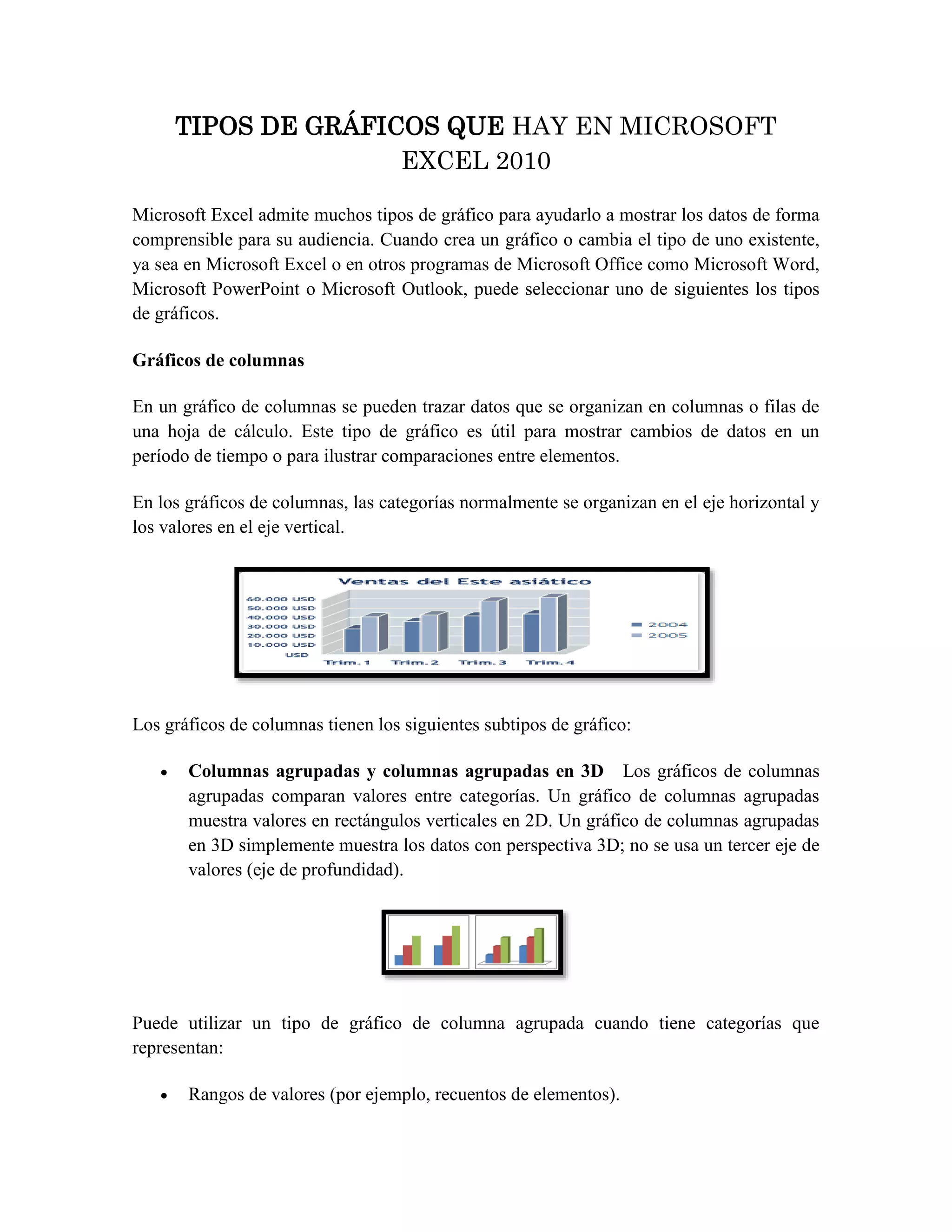 El documento describe los diferentes tipos de gráficos que se pueden crear en Microsoft Excel 2010, incluyendo gráficos de columnas, líneas, circulares y de barras. Explica que los gráficos de columnas son útiles para mostrar cambios en el tiempo o comparaciones, mientras que los gráficos de líneas muestran tendencias en datos a intervalos iguales. Los gráficos circulares representan datos como porcentajes de un total, y los gráficos de barras comparan elementos individuales. Para cada tipo de gráfico, detalla sus diferentes subtip