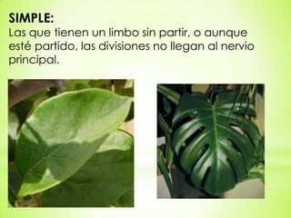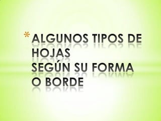 Este documento describe los diferentes tipos de hojas basados en su forma, borde, composición y disposición de los foliolos. Identifica hojas simples, compuestas con diferentes números y disposiciones de foliolos, y proporciona ejemplos de árboles con cada tipo. Las hojas se pueden describir usando términos como oval, aserrada, acorazonada, digitada y más.
