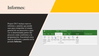 El documento describe los diferentes tipos de informes incluidos en Project 2013, incluyendo informes de panel, informes de costos, informes de recursos e informes visuales en Excel o Visio. Los informes de panel muestran el estado general del proyecto, mientras que los informes de costos se enfocan en el flujo de efectivo y los sobrecostos. Los informes de recursos brindan información sobre recursos sobrecargados y la visión general de los recursos. Finalmente, los informes visuales permiten ver datos de proyecto