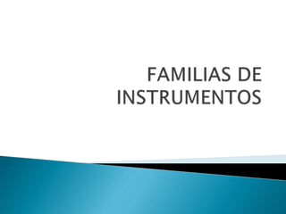 Este documento describe los principales tipos de instrumentos musicales, dividiéndolos en de cuerda y de viento. Los instrumentos de cuerda producen sonido a través de la vibración de cuerdas, ya sea frotadas con arco, pulsadas con los dedos o percutidas con martillos. Los instrumentos de viento producen sonido a través de la vibración de una columna de aire soplada, dividiéndose en de madera, con un sonido dulce, y de metal, con un sonido más potente.
