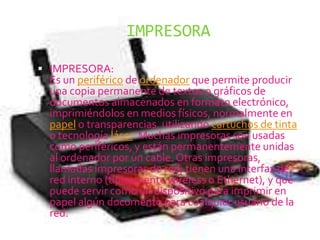 Este documento describe cuatro periféricos de ordenador: la impresora, que produce copias impresas de documentos electrónicos; el monitor, que muestra los resultados del procesamiento; el teclado, que envía información a la computadora a través de teclas; y los cartuchos, que alojan memoria externa para su conexión a dispositivos electrónicos.