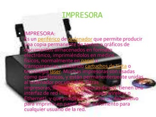 Este documento describe cuatro periféricos de ordenador: la impresora, que produce copias impresas de documentos electrónicos; el monitor, que muestra los resultados del procesamiento; el teclado, que envía información a la computadora a través de teclas; y los cartuchos, que alojan memoria externa para su conexión a dispositivos electrónicos.