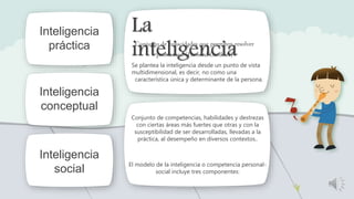 El documento describe diferentes tipos de inteligencia según Howard Gardner, incluyendo la inteligencia práctica, conceptual y social. Explica que la inteligencia debe entenderse como multidimensional y no como una única característica. También describe cómo estas diferentes inteligencias se relacionan con la conducta adaptativa de las personas con discapacidad intelectual.