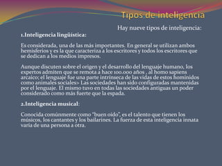 Hay nueve tipos de inteligencia que incluyen la inteligencia lingüística, musical, lógico-matemática, espacial, corporal-kinestésica, emocional, intrapersonal, interpersonal y naturalista. Cada tipo de inteligencia se utiliza de diferentes maneras y es importante desarrollar una variedad de habilidades para funcionar en un mundo complejo. Aunque todos tenemos los nueve tipos de inteligencia en diferentes grados, factores como la educación, la familia y el entorno influyen en qué áreas se desarrollan más