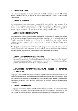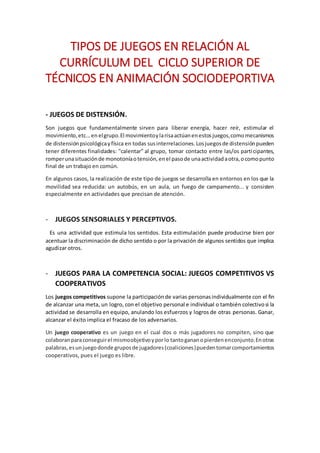 Este documento describe diferentes tipos de juegos en relación al currículo de técnicos en animación sociodeportiva, incluyendo juegos de distensión, sensoriales y perceptivos, para la competencia social como cooperativos y competitivos, motores, populares, en el medio natural e instalaciones acuáticas, deportivo-recreativos y alternativos, de expresión, y actividades físico-recreativas.