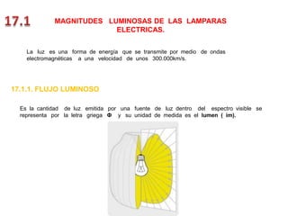 Este documento describe las principales magnitudes luminosas y tipos de lámparas eléctricas. Explica conceptos como flujo luminoso, eficacia luminosa, índice de reproducción cromática y temperatura de color. Luego detalla los diferentes tipos de lámparas, incluyendo incandescentes, fluorescentes, de vapor de mercurio, sodio y halógenas. El documento proporciona información técnica sobre las características y especificaciones de cada tipo de lámpara.