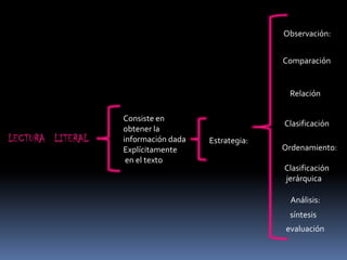 Este documento describe cuatro tipos de lectura: lectura literal, que consiste en obtener la información explícitamente dada en el texto; lectura crítica, que implica evaluar y formar opiniones sobre lo que el escritor dice; lectura analógica, que permite trasladar relaciones de un ámbito a otro e interpretar temáticas; y lectura inferencial, que implica realizar conclusiones no explícitamente dichas en el texto.