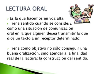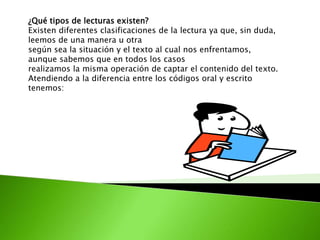 Existen diferentes tipos de lectura según la situación y el objetivo. Algunos tipos incluyen la lectura en voz alta, silenciosa, extensiva (por placer), intensiva (para obtener información), rápida y superficial, e involuntaria a través de anuncios públicos. La lectura también puede ser integral, incluyendo lectura reflexiva y mediana, o selectiva para encontrar datos específicos. El tipo de lectura apropiado depende del texto y propósito.