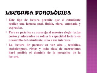 El documento describe los diferentes tipos de lectura que existen: fonológica, denotativa, connotativa, de extrapolación, de recreación y de estudio. Cada tipo de lectura tiene un propósito diferente como la comprensión literal inicial, encontrar el tema e interpretar implícitos, utilizar la lectura para adquirir conocimientos o desarrollar pensamiento crítico.