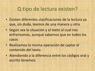 La lectura puede ser oral o silenciosa y tiene diferentes tipos como la lectura científica, investigativa y de estudio. La lectura científica proporciona información sobre avances tecnológicos e investigaciones que permiten ampliar conocimientos. La lectura investigativa implica subrayar ideas clave y realizar resúmenes para estudiar de manera más efectiva. La lectura de estudio se hace a una velocidad entre 0 y 200 palabras por minuto tomando notas y analizando el material de forma profunda.