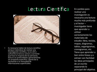 La lectura científica requiere una lectura más profunda que la lectura común, para extraer las ideas principales y separar lo principal de lo secundario. Se debe aprender a leer entre líneas y utilizar correctamente materiales como libros, revistas, mapas y tablas. Existen diferentes tipos de lectura como la receptiva, que implica agrupar ideas para sacar conclusiones, y la rápida, que busca una visión general sin profundidad. La lectura informativa se usa para periódicos, revistas y novelas de manera rápida y