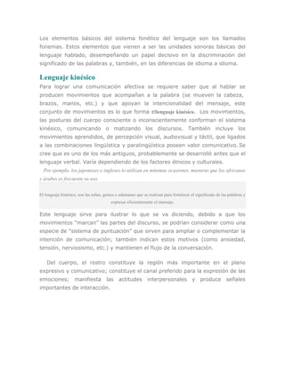 El documento describe diferentes tipos de lenguaje y sus funciones. El lenguaje tiene funciones cognitiva y comunicativa que se realizan principalmente a través del lenguaje fonético, kinésico, proxémico e icónico. El lenguaje fonético se refiere a los sonidos convencionales de una región, el kinésico a los gestos y movimientos, el proxémico a la distancia en conversaciones, y el icónico utiliza imágenes para transmitir mensajes. Cada tipo de lenguaje cumple un propósito comunicativo diferente.
